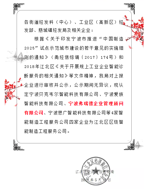 宁波弗瑞德公司为宁波市经信委培训合作机构、宁波市市级管理咨询机构、宁波市区级智能制造工程服务机构、宁波市成长型人力资源服务机构、浙江省咨询与培训协会常务理事、国家级“两化”融合管理体系辅导机构。