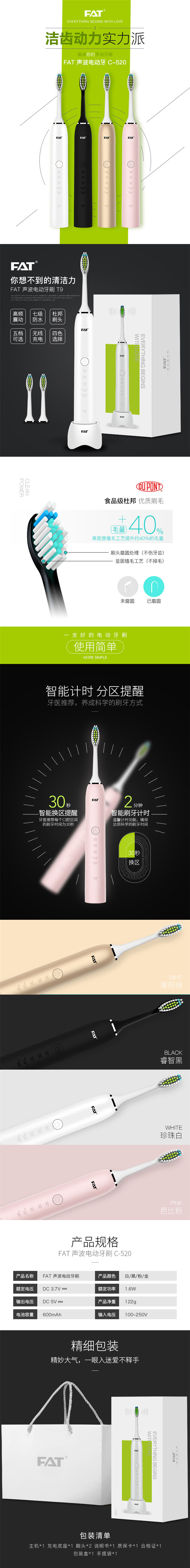 FAT声波电动牙刷 C-520 高频震动、七级防水 进口食品级杜邦刷毛、精妙工艺五金按键 25天左右续航、正品塑封包装 送给亲朋好友也是极好的!