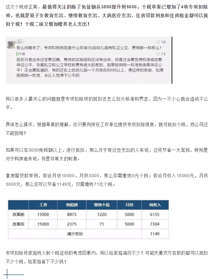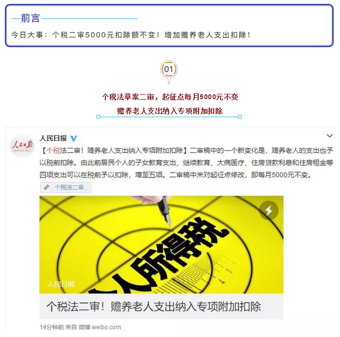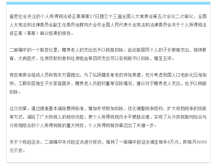 重磅!个税二审5000元扣除额不变!增加赡养老人支出扣除!