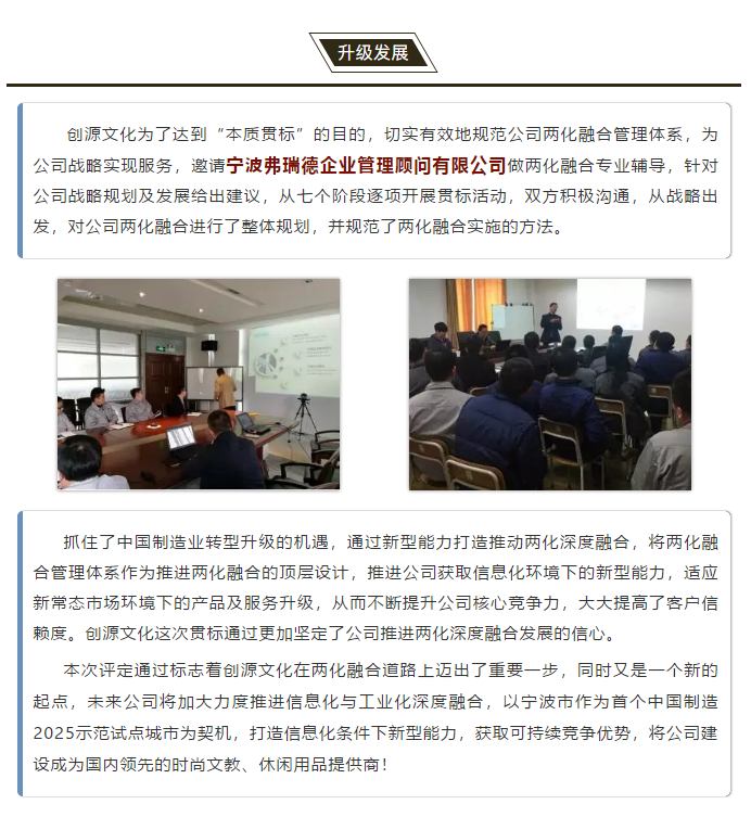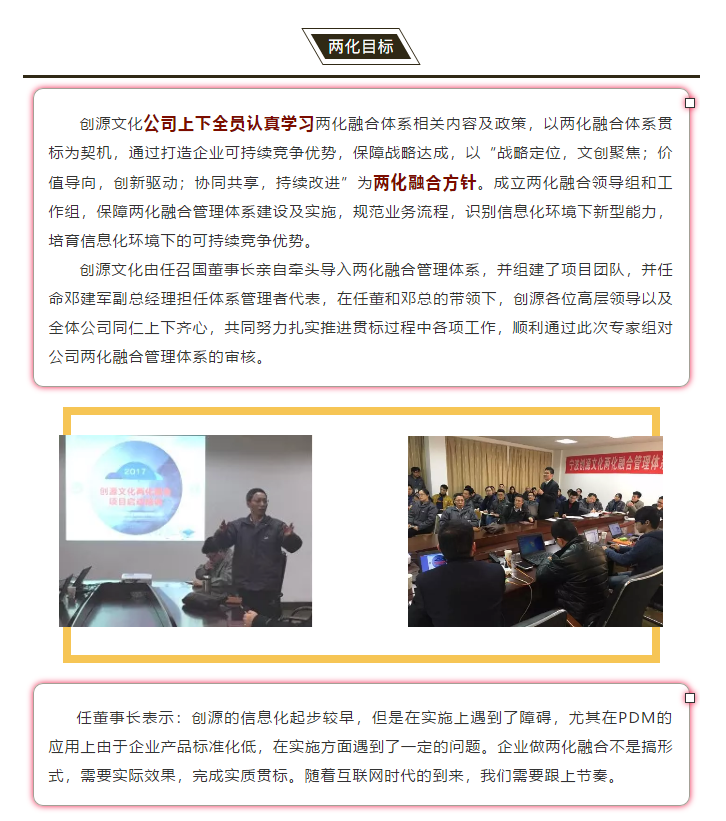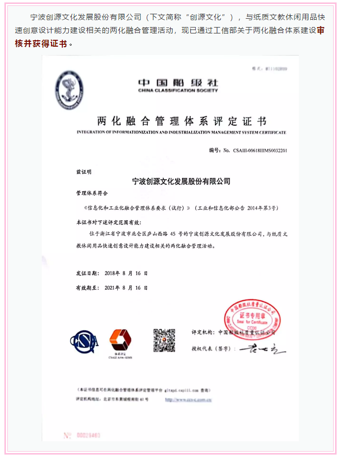 宁波创源文化发展股份有限公司《两化融合管理体系》通过工信部评定