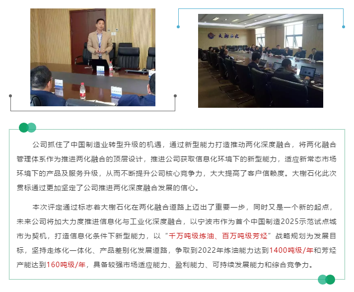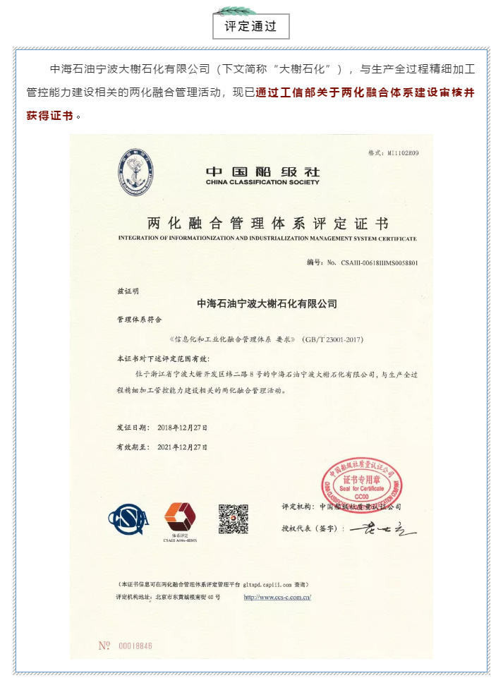 中海石油宁波大榭石化有限公司《两化融合管理体系》通过工信部评定