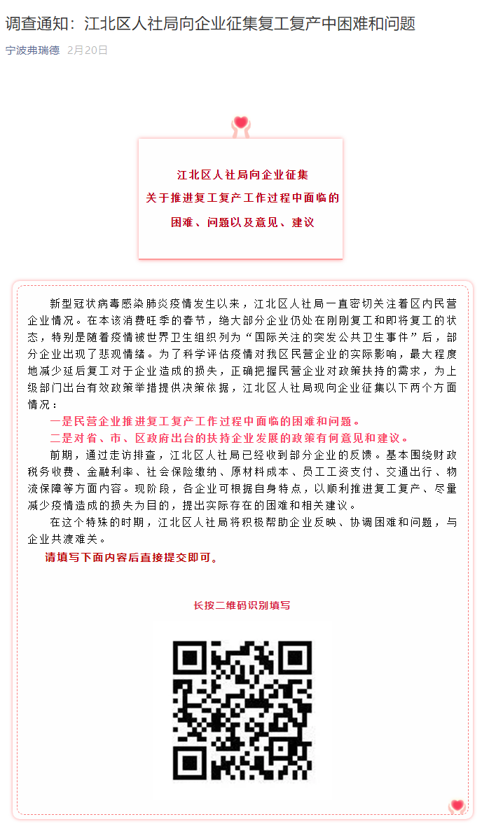 调查通知:江北区人社局向企业征集复工复产中困难和问题